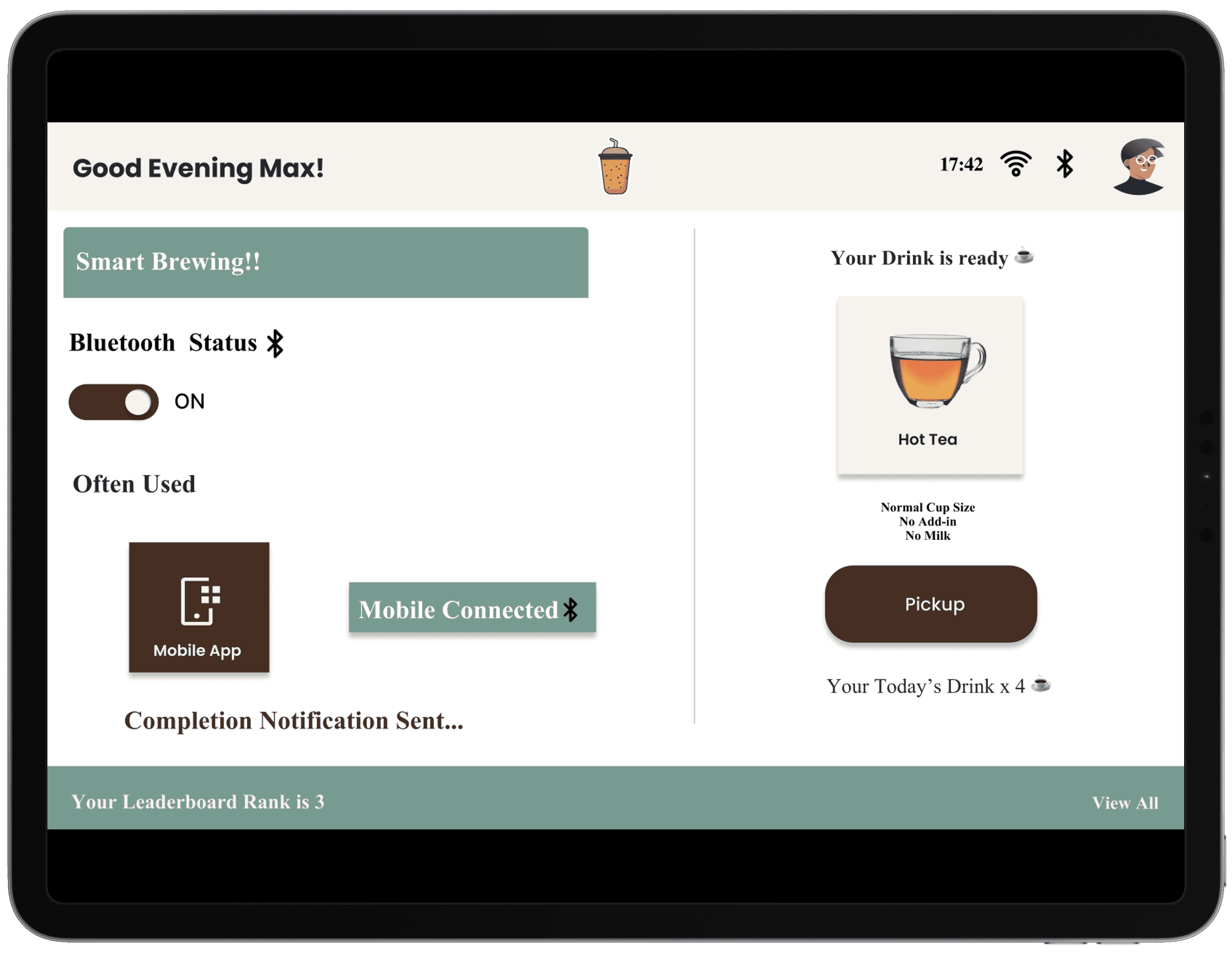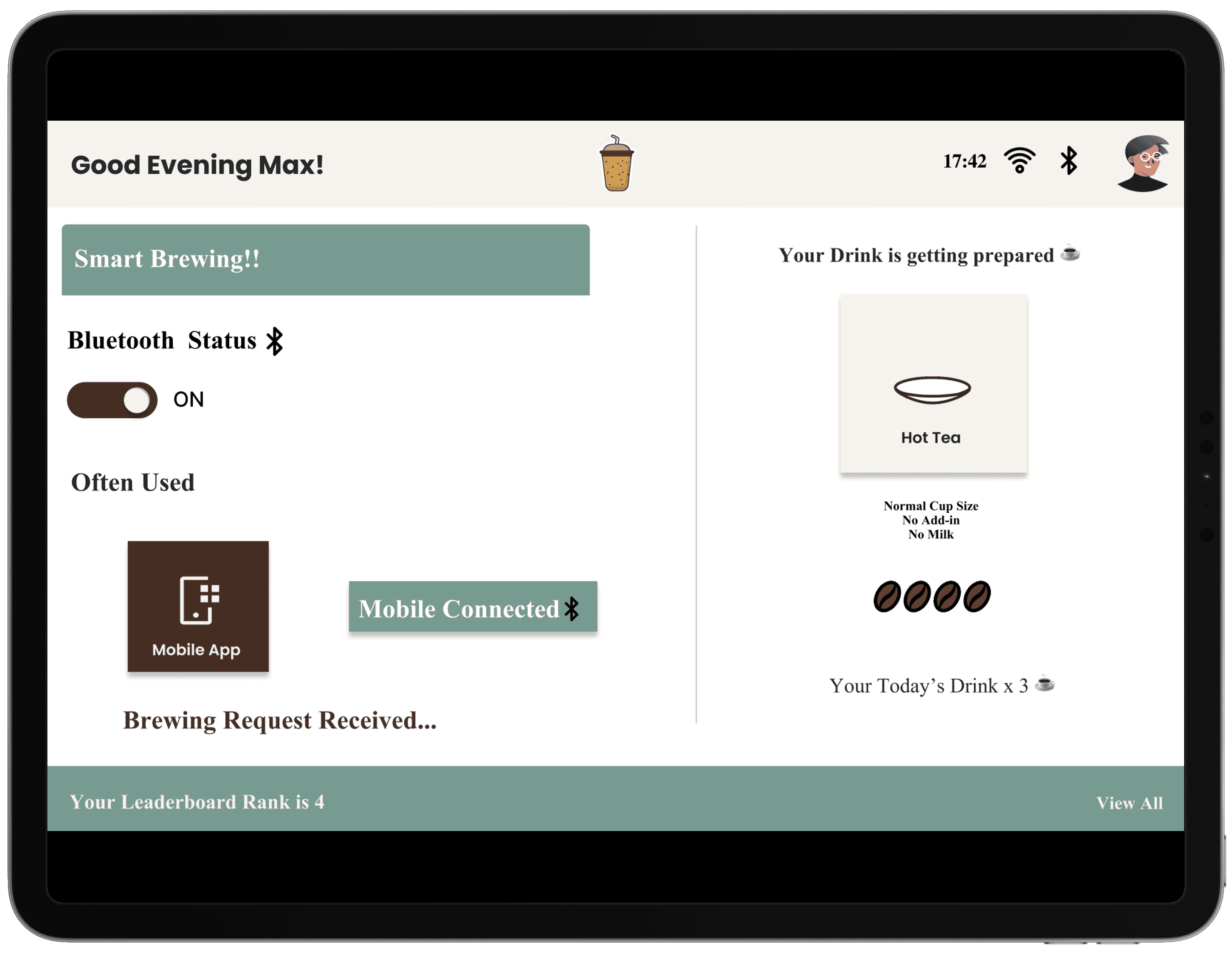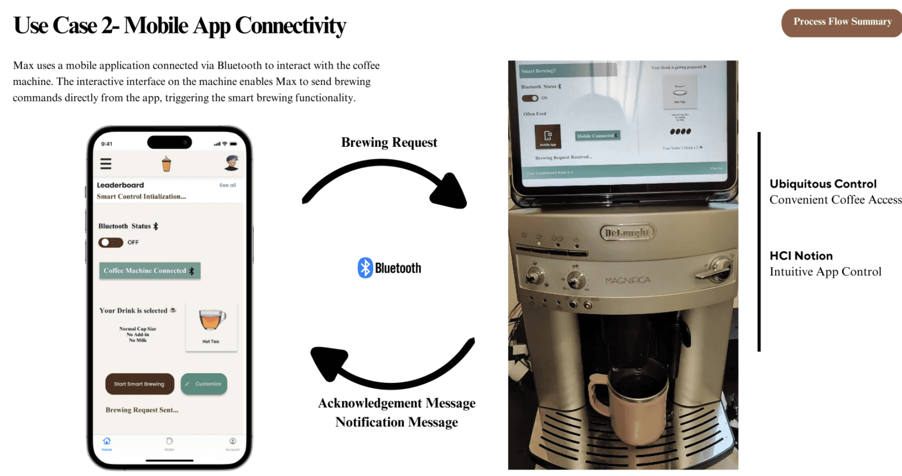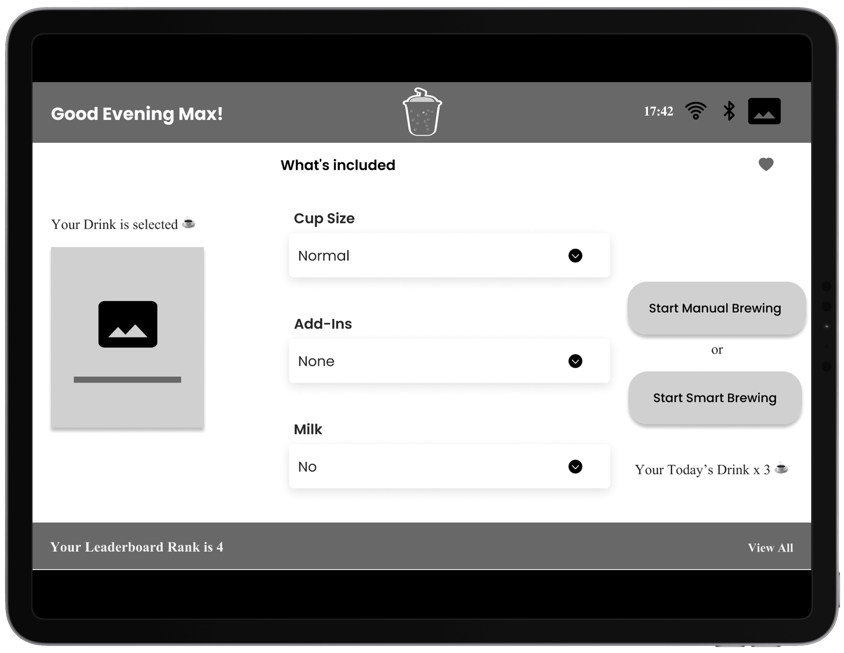 In this project, the interaction design was built to simplify the coffee-making process for users, regardless of their technical expertise. Both the BrewView interface and the mobile app were designed with intuitive touch controls and clear visual cues, allowing users to easily navigate through brewing options and settings. A key focus was on reducing the number of steps needed to complete a task, ensuring a quick and hassle-free experience.