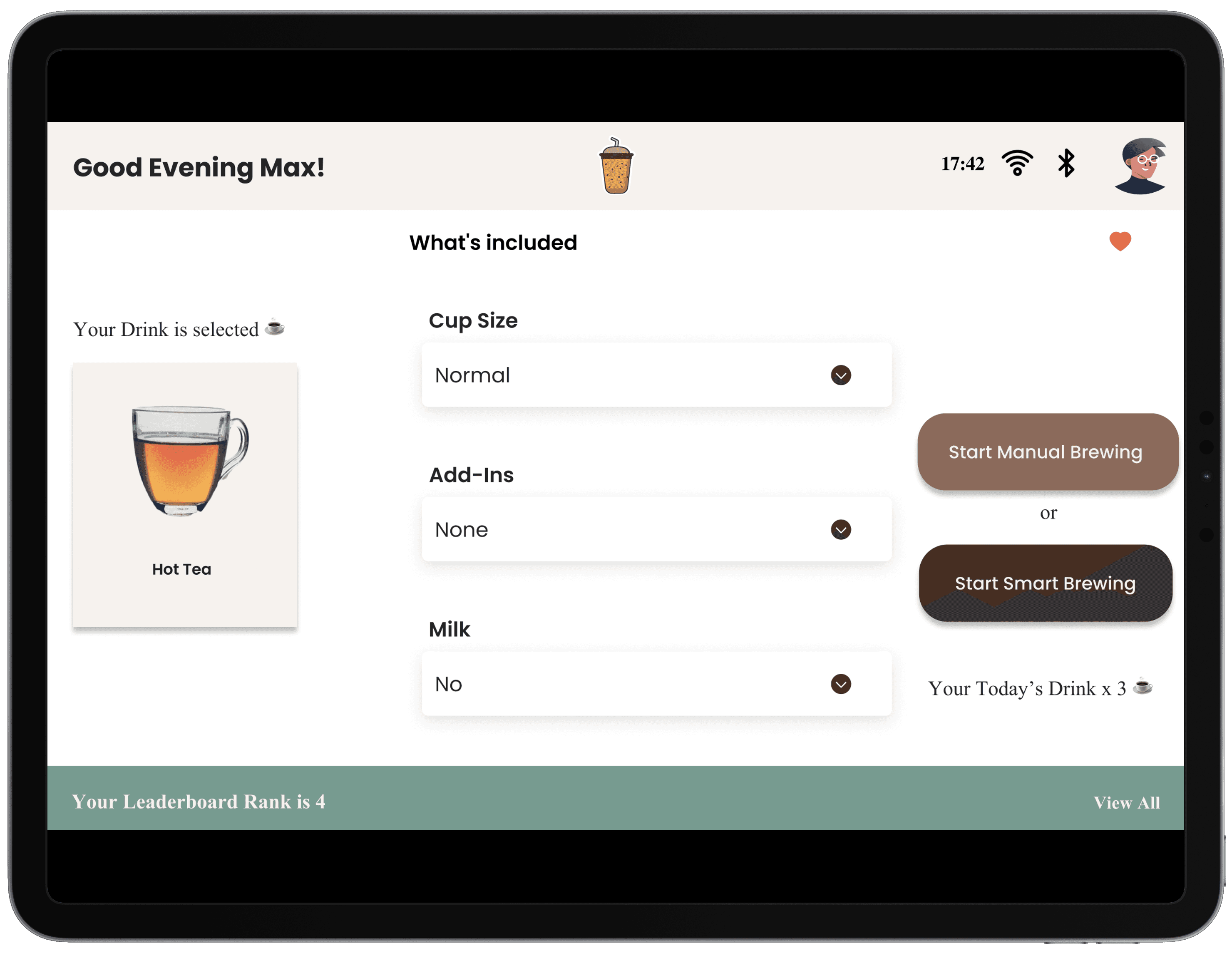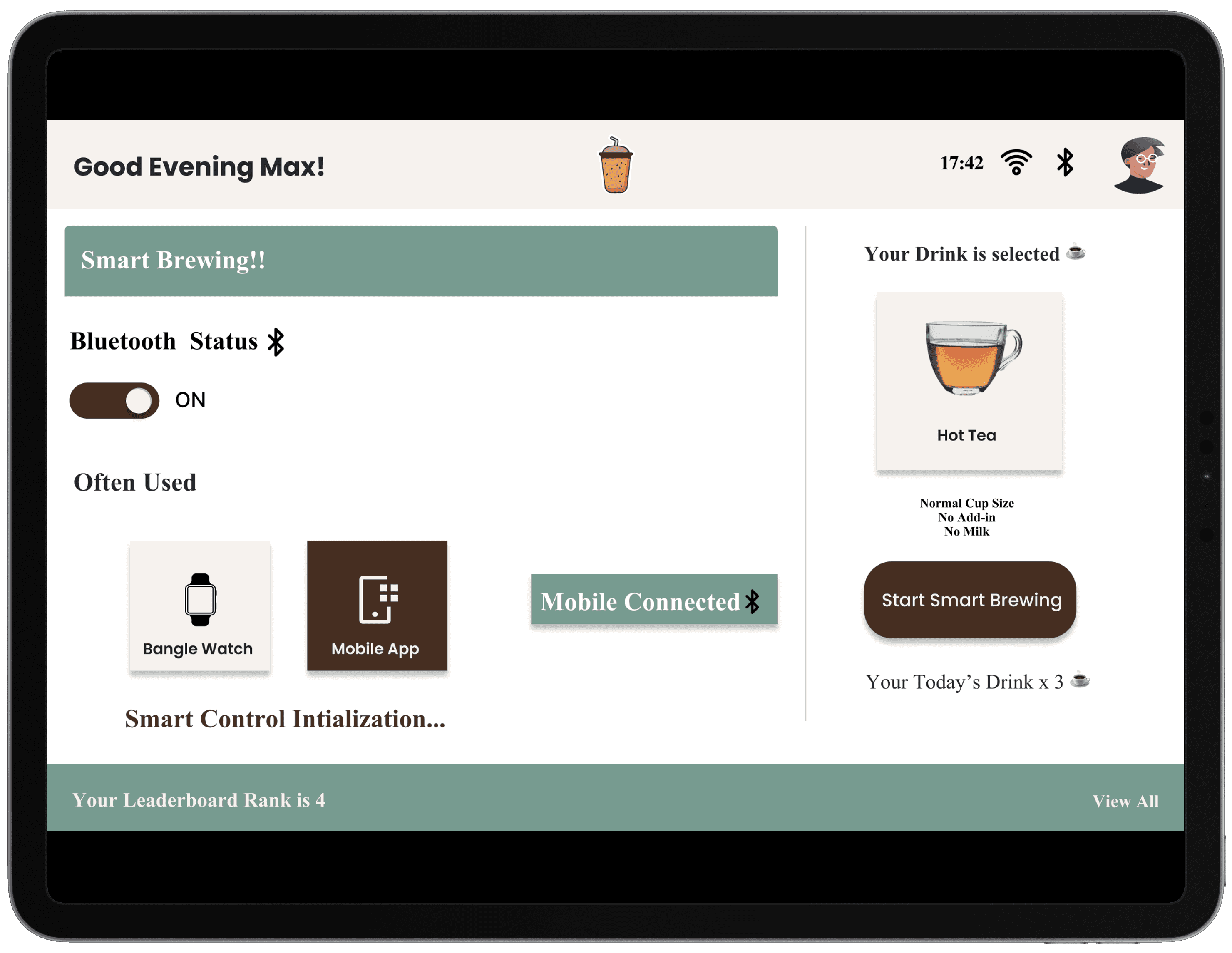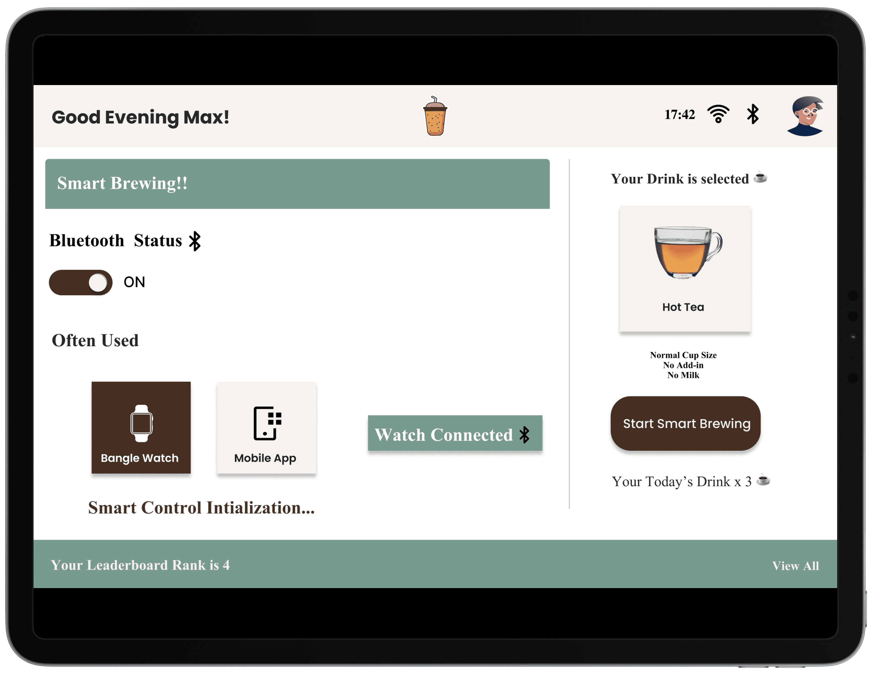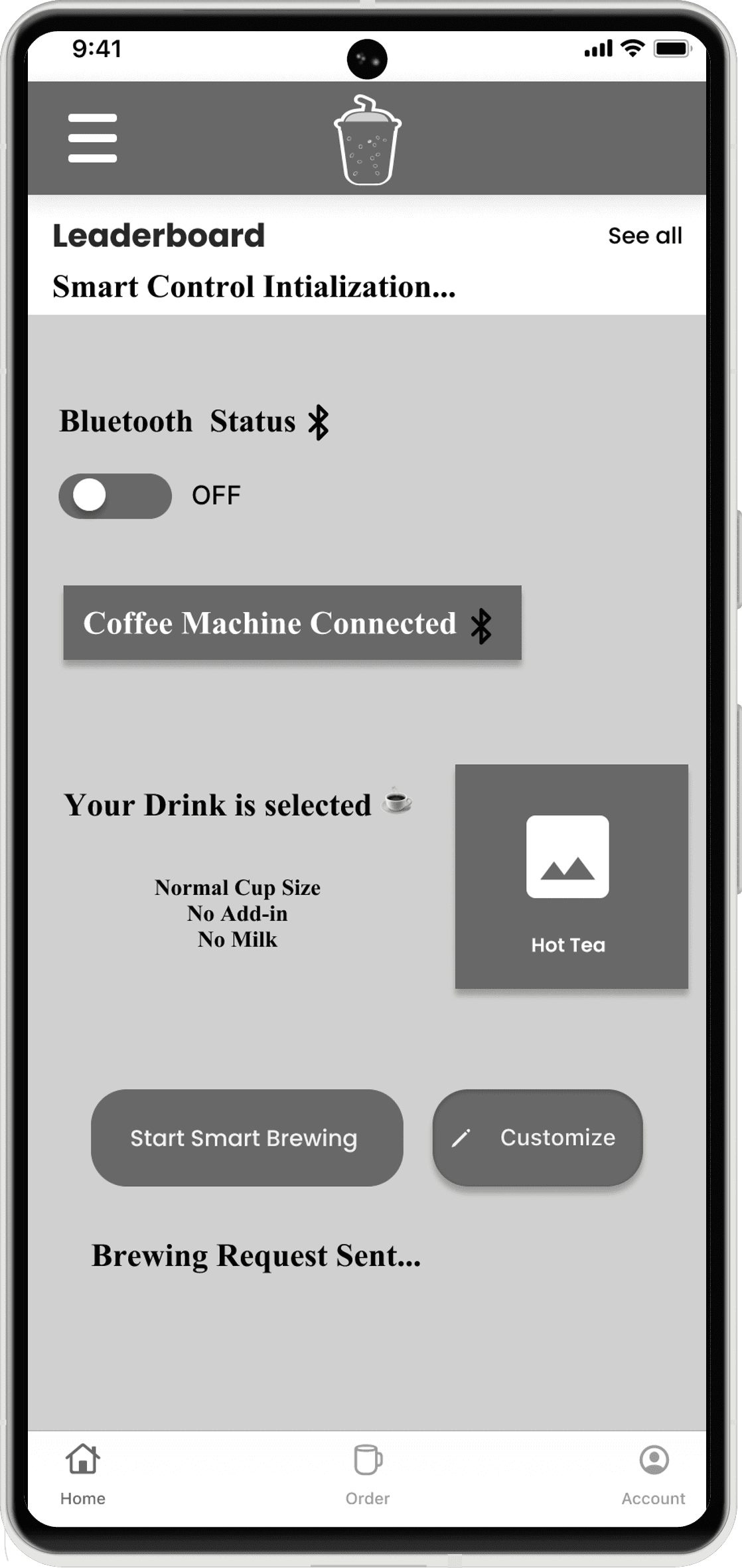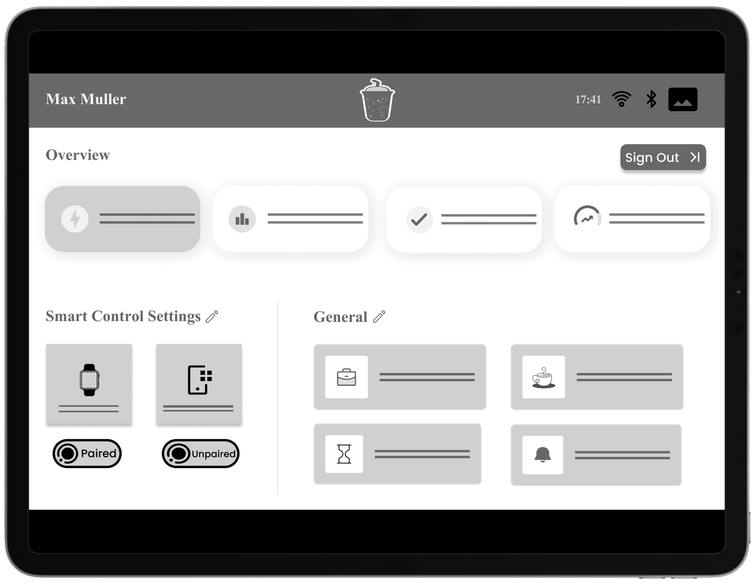 In this project, the interaction design was built to simplify the coffee-making process for users, regardless of their technical expertise. Both the BrewView interface and the mobile app were designed with intuitive touch controls and clear visual cues, allowing users to easily navigate through brewing options and settings. A key focus was on reducing the number of steps needed to complete a task, ensuring a quick and hassle-free experience.