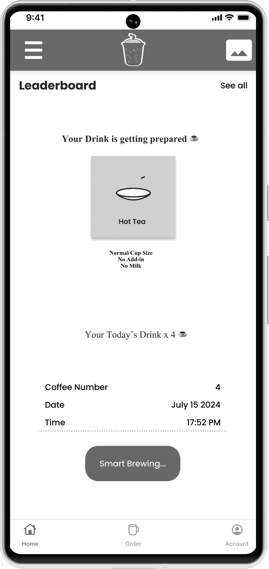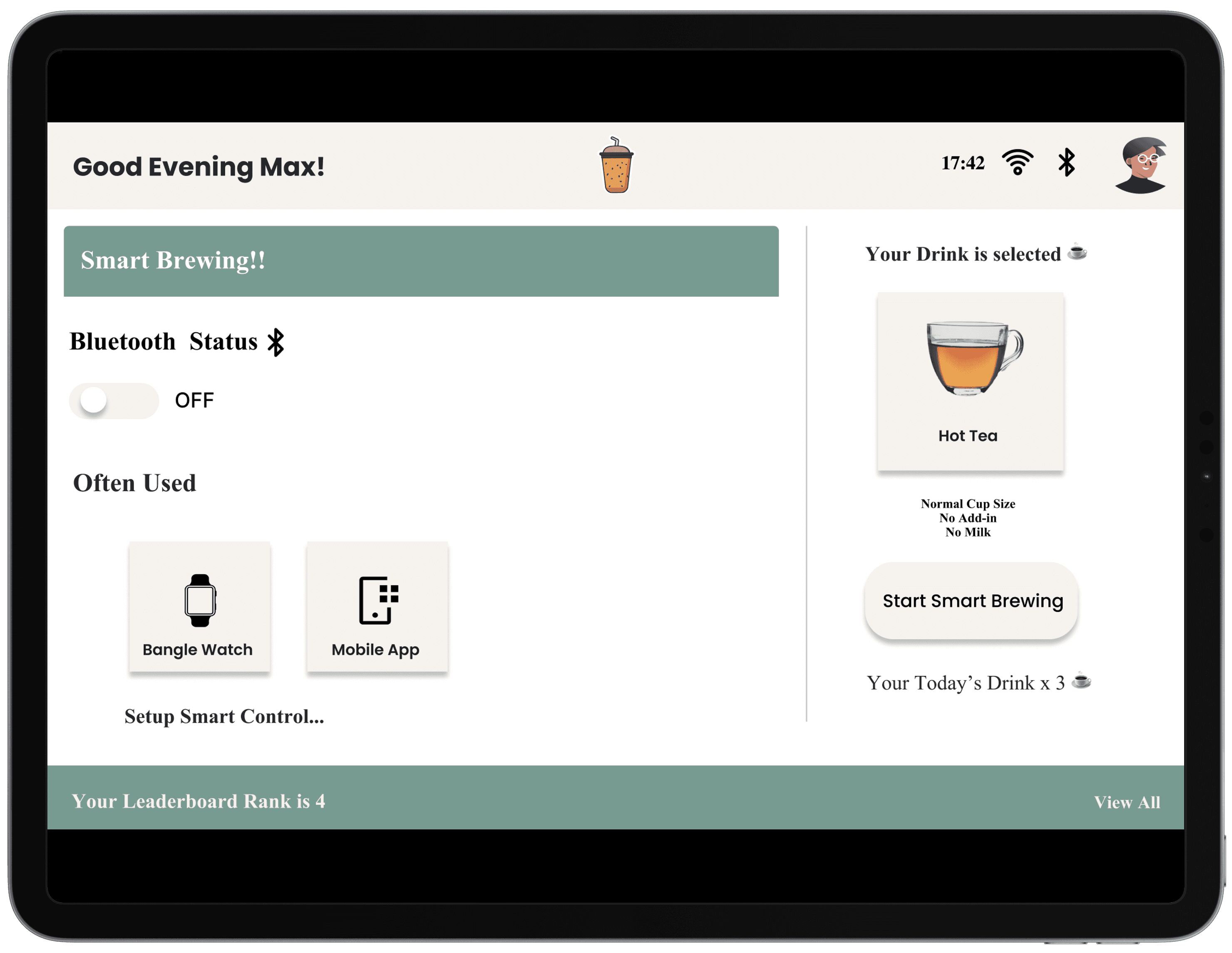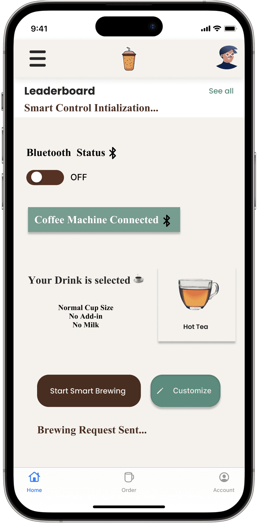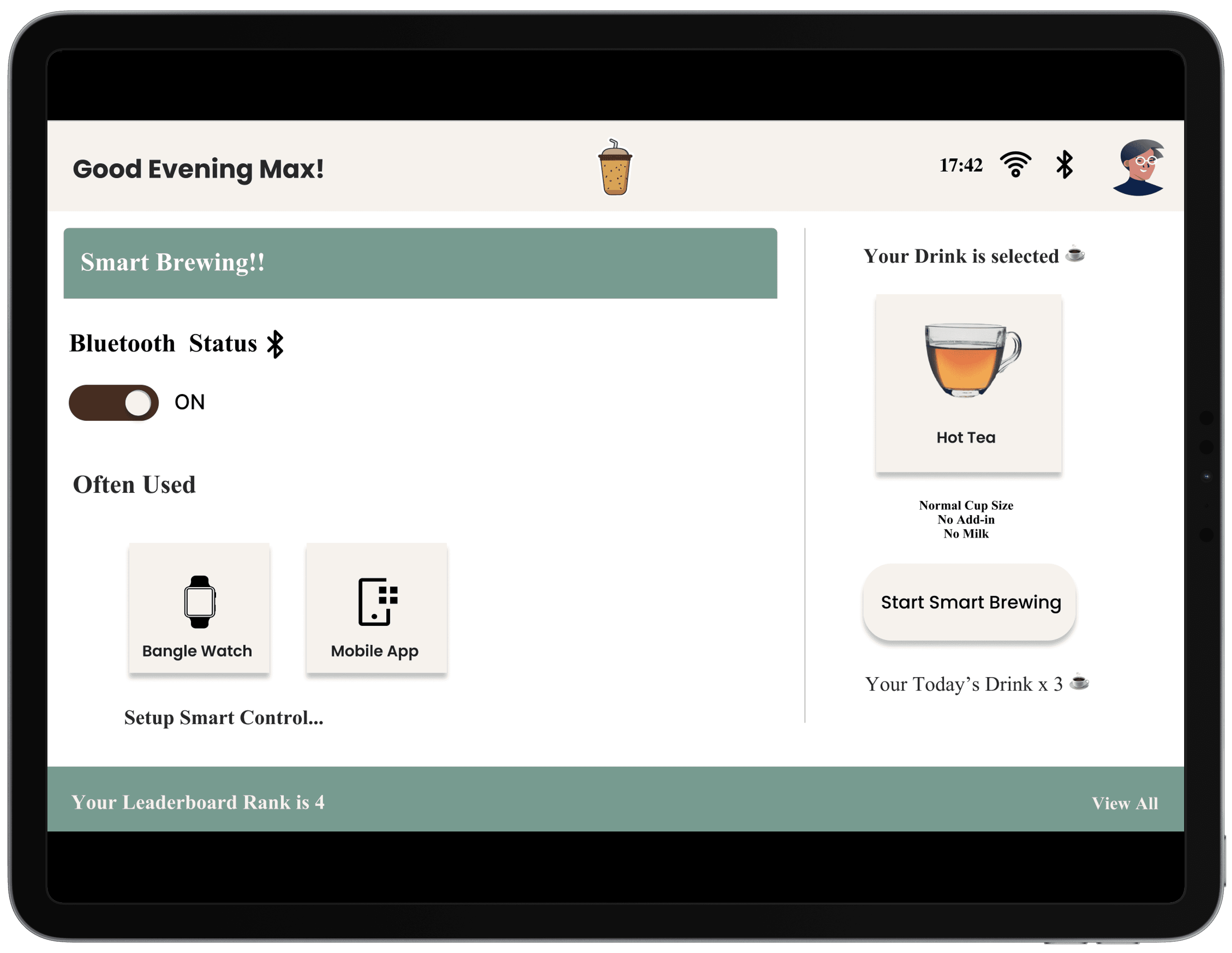 In this project, the interaction design was built to simplify the coffee-making process for users, regardless of their technical expertise. Both the BrewView interface and the mobile app were designed with intuitive touch controls and clear visual cues, allowing users to easily navigate through brewing options and settings. A key focus was on reducing the number of steps needed to complete a task, ensuring a quick and hassle-free experience.