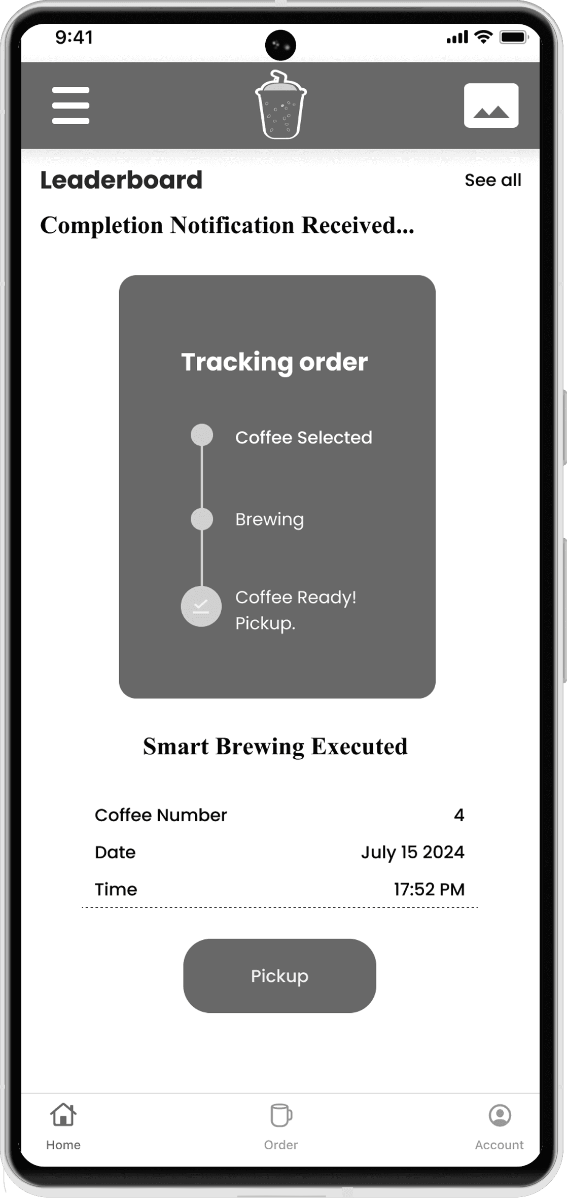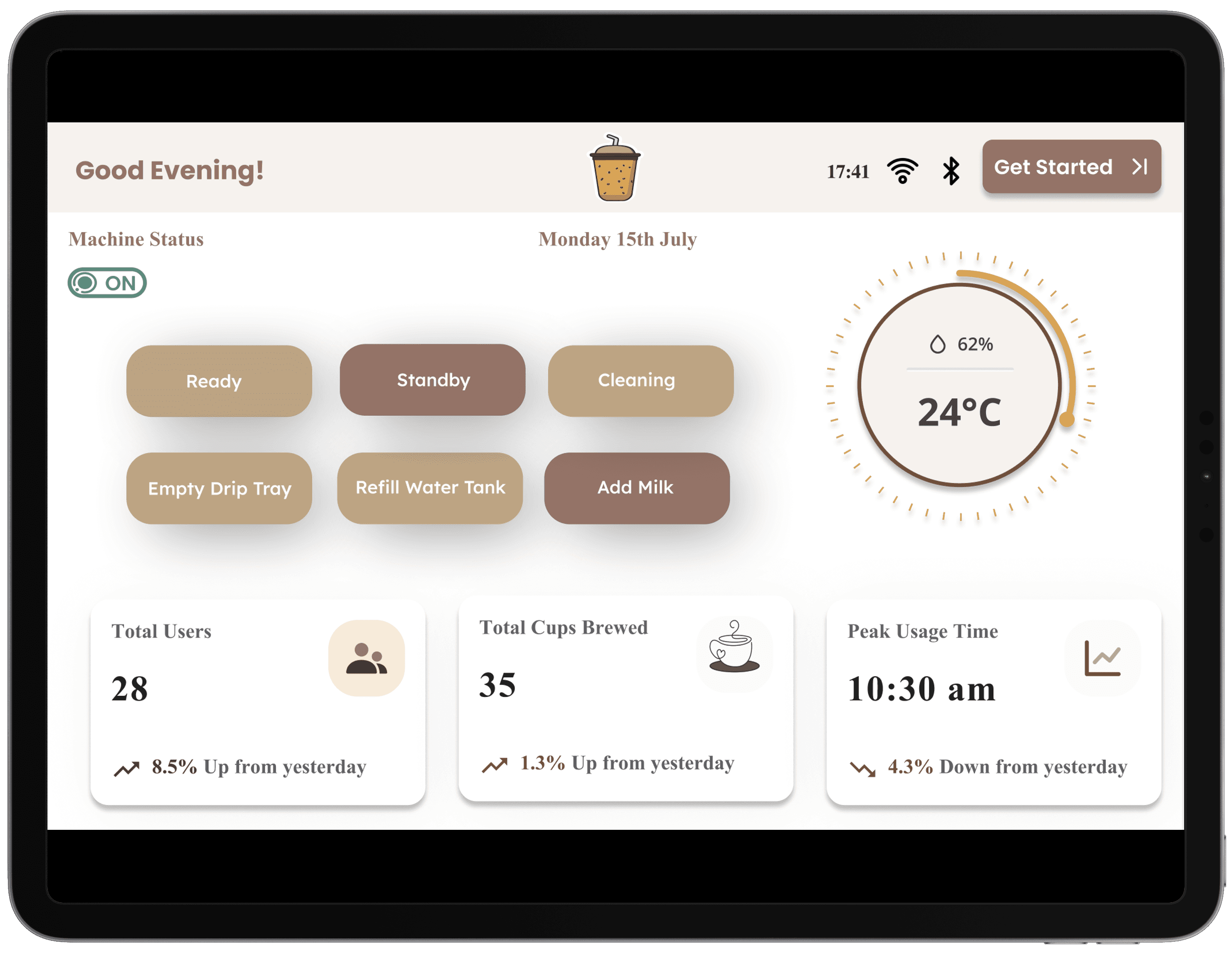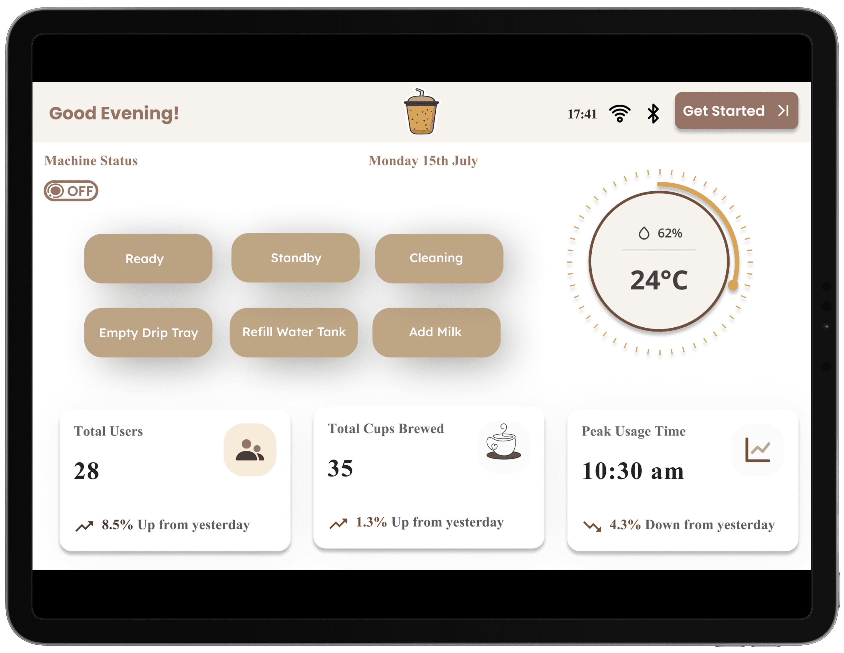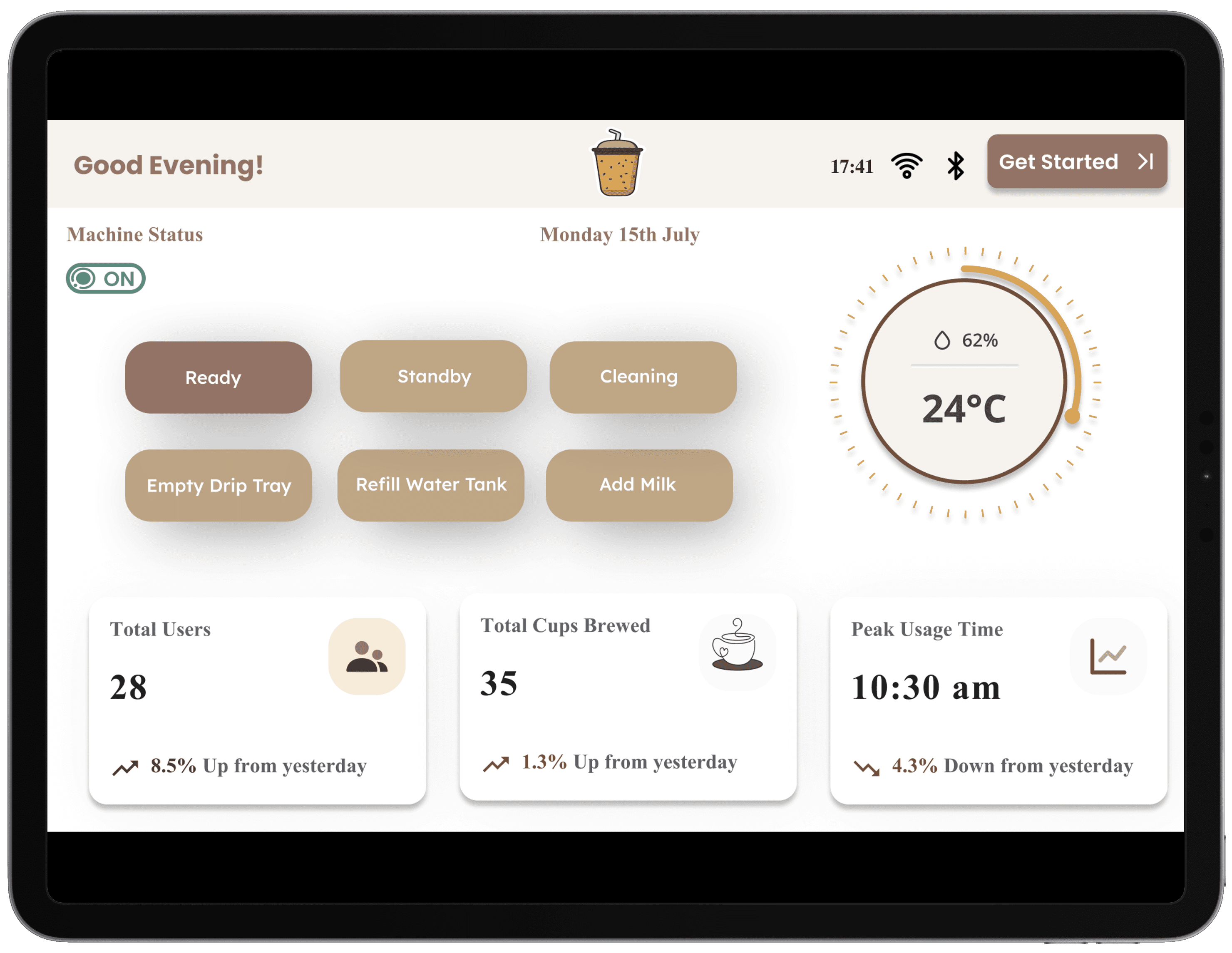The UI for BrewView was designed to be intuitive and minimalistic, allowing users to interact easily with the coffee machine. Large buttons, clear icons, and simple navigation ensure that users can quickly access the features.