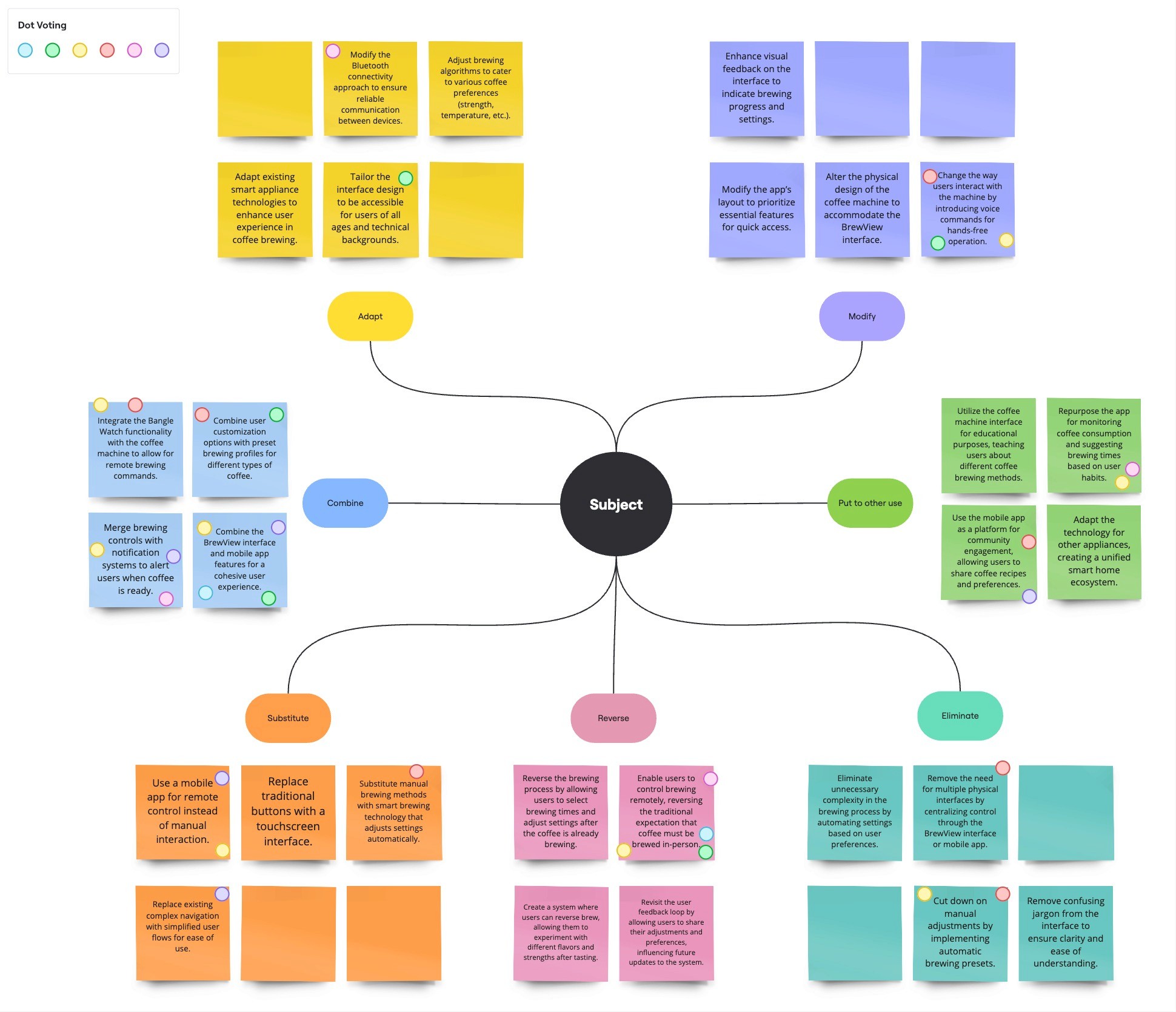 The S.C.A.M.P.E.R. Miro template was collaboratively utilized by the Ubicomp professor, student assistants, project supervisor, and me (the UX designer) during the ideation phase, followed by a dot voting session to prioritize ideas.