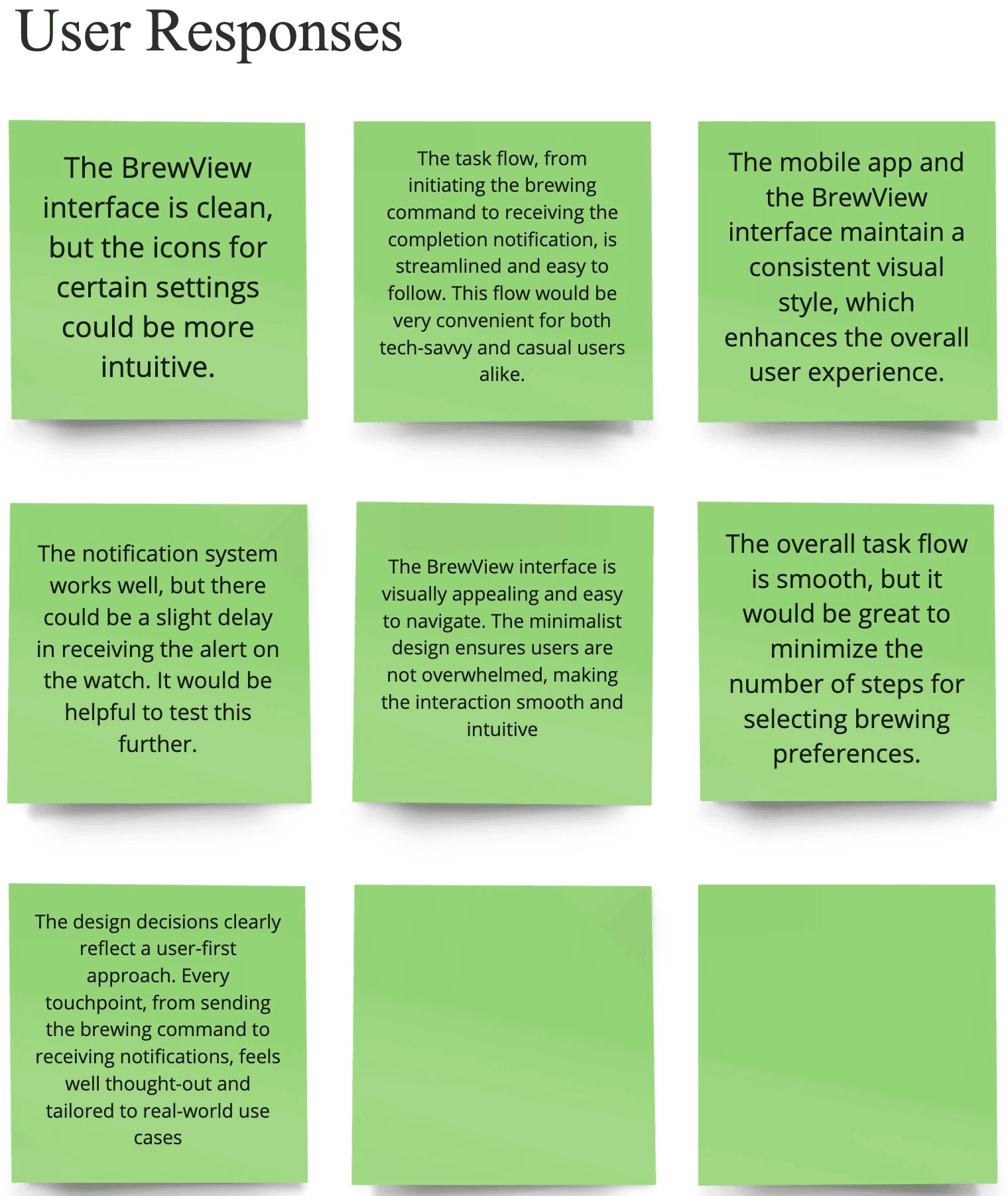 The Usability Testing phase of the Smart Coffee Machine project aimed to assess the effectiveness, ease of use, and overall experience of both the BrewView interface and the mobile app. The final Figma prototype videos of both the BrewView interface and mobile app, showcasing the interactive elements, task flows, and design responsiveness.