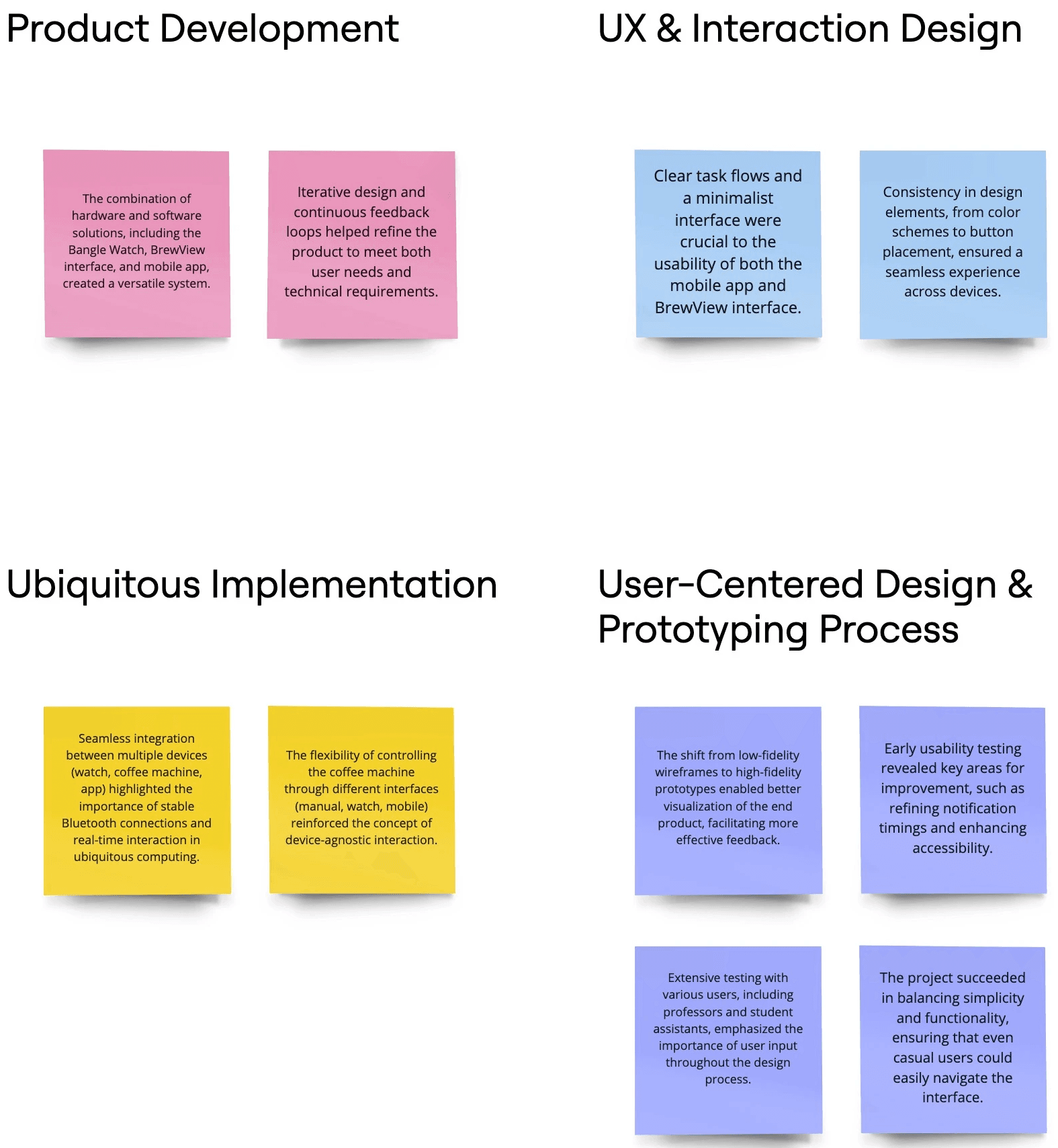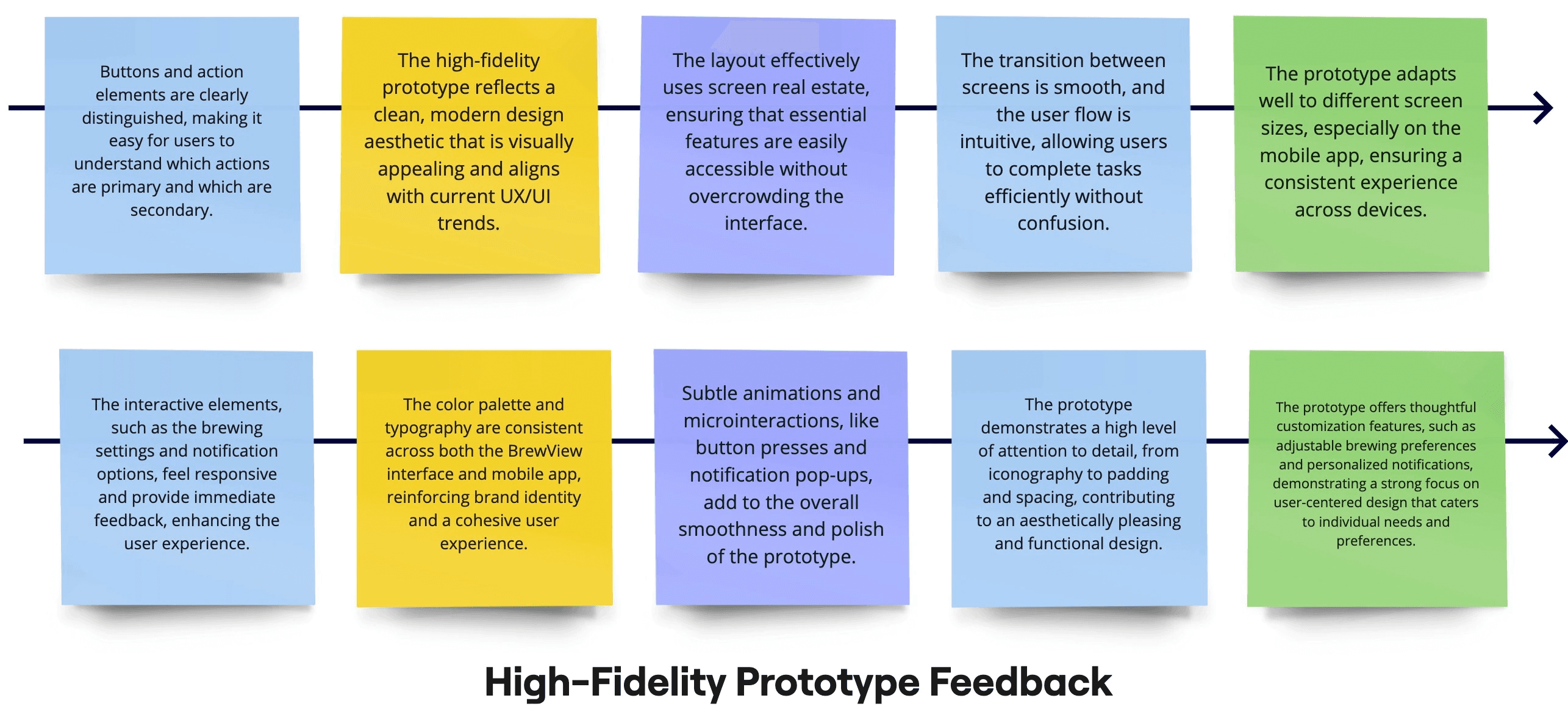 This feedback highlights how well the prototype adapts to diverse user preferences, enhancing overall user satisfaction and engagement. The feedback received from professors, student assistants, and fellow UX students on the high-fidelity prototype of the Smart Coffee Machine project has been overwhelmingly positive. Their insights highlighted the effectiveness of the design in enhancing user experience and the seamless interaction across devices.