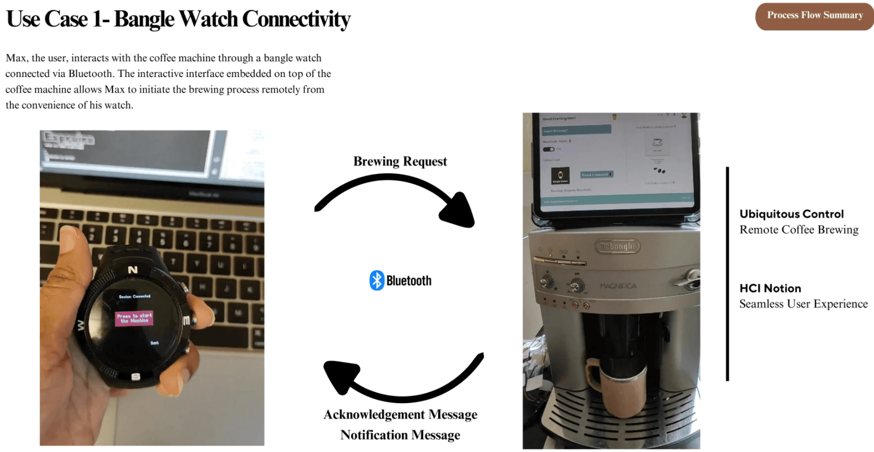 To test the seamless interaction between the Bangle Watch and the BrewView interface, ensuring the command is properly transmitted, acknowledged, and executed by the coffee machine via Bluetooth.The final Figma prototype videos of both the BrewView interface and mobile app, showcasing the interactive elements, task flows, and design responsiveness.