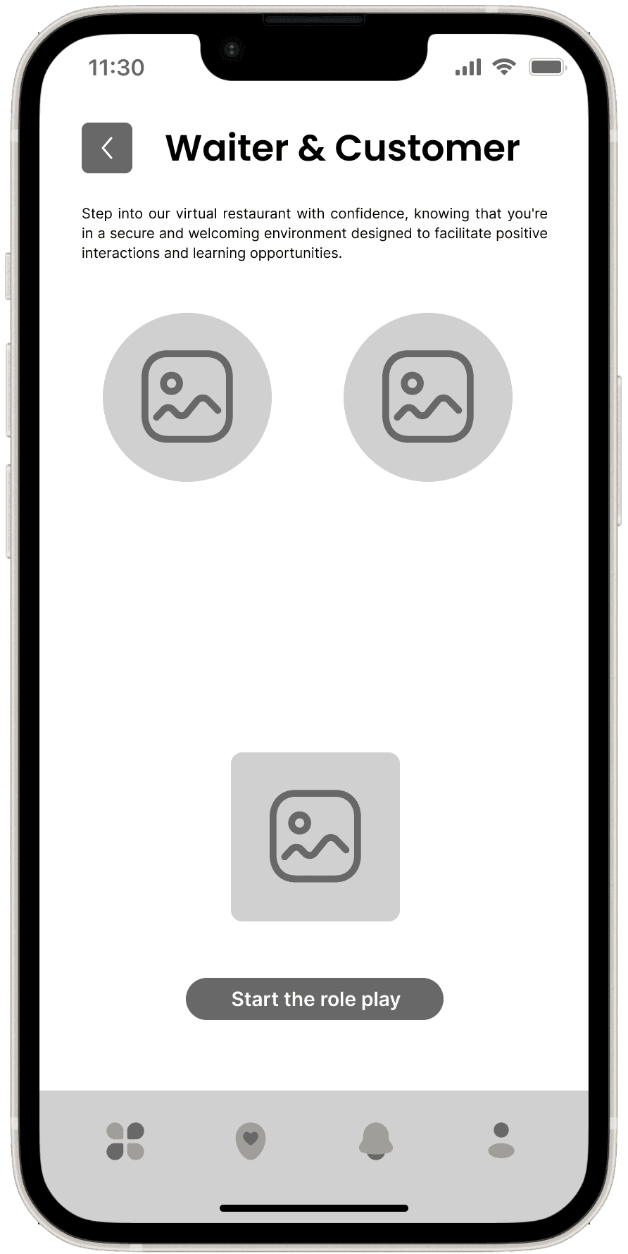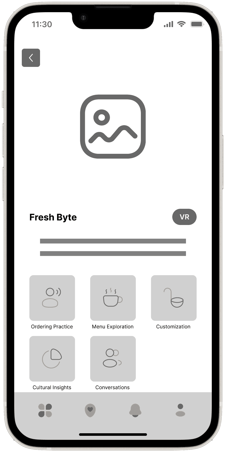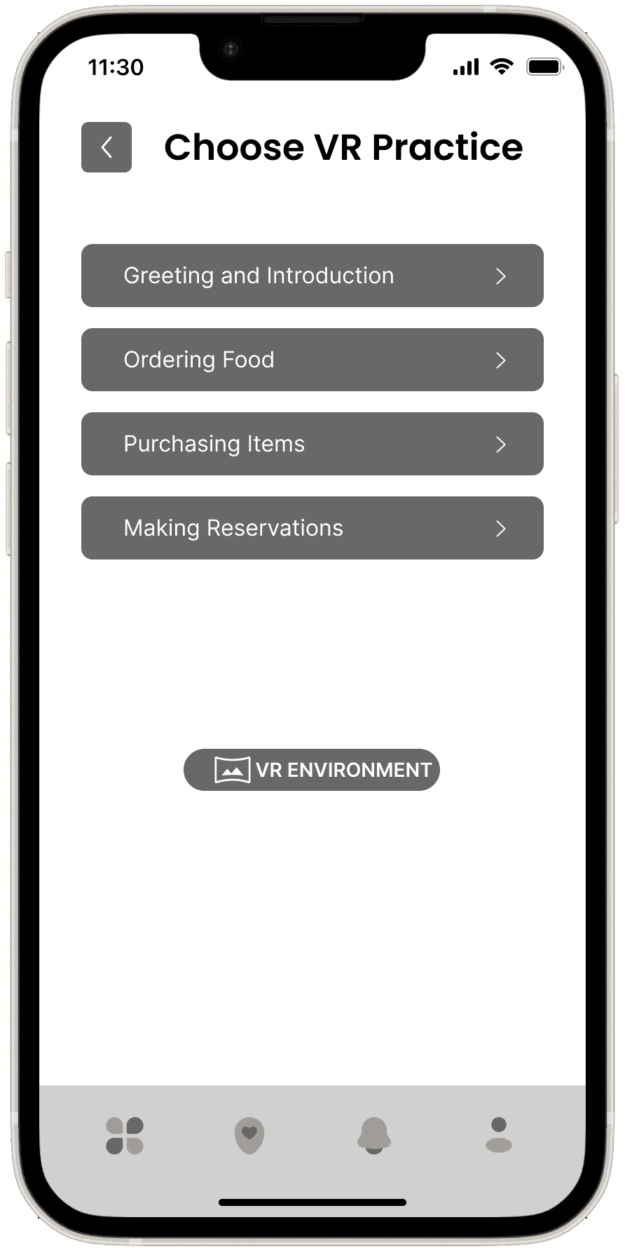 The Wireframes section for the VR Language Learning Application presents a low-fidelity visual outline of the app’s interface and key interactions. These wireframes focus on mapping out the core features and user flows, ensuring that the design supports seamless language practice in an immersive environment.