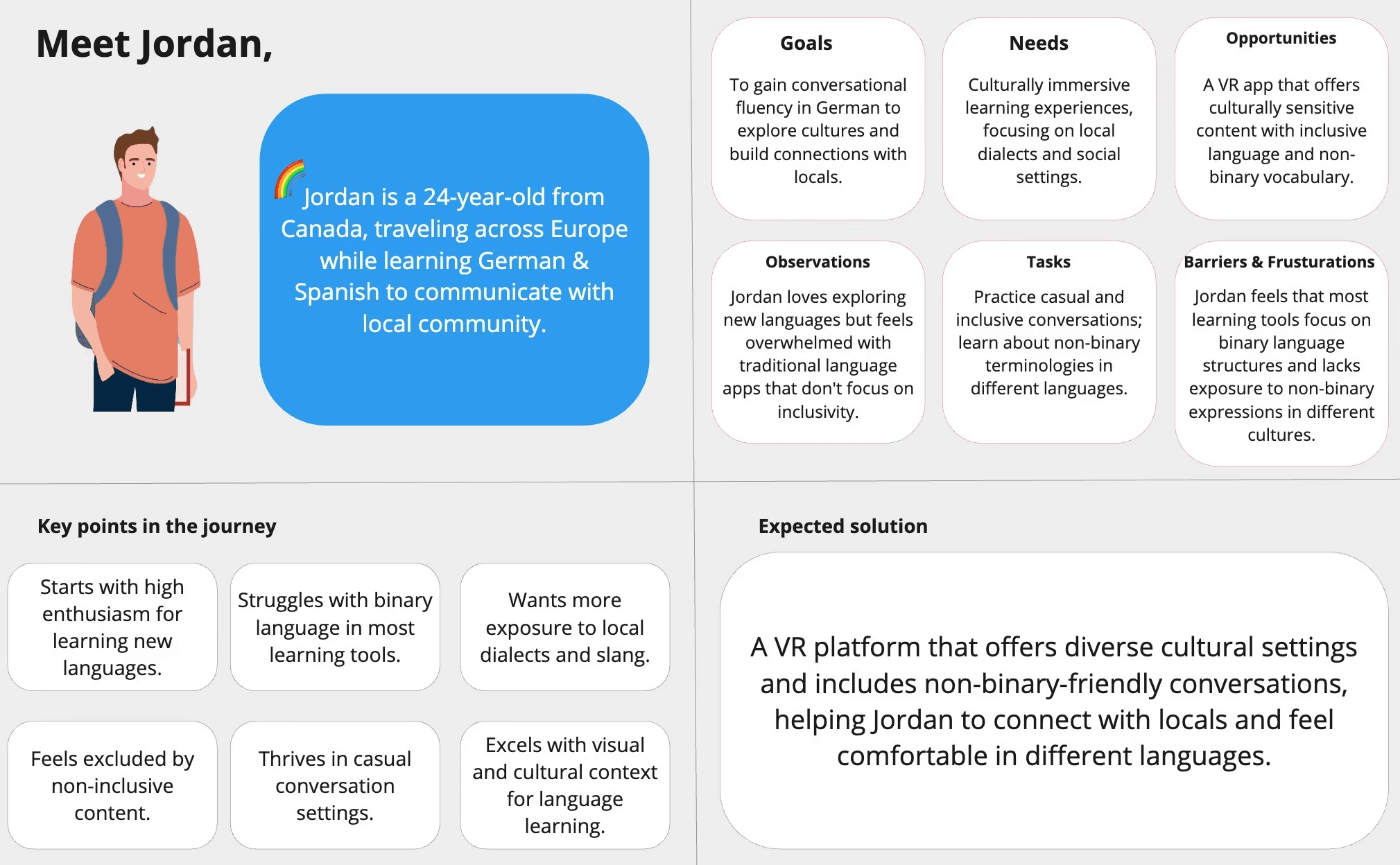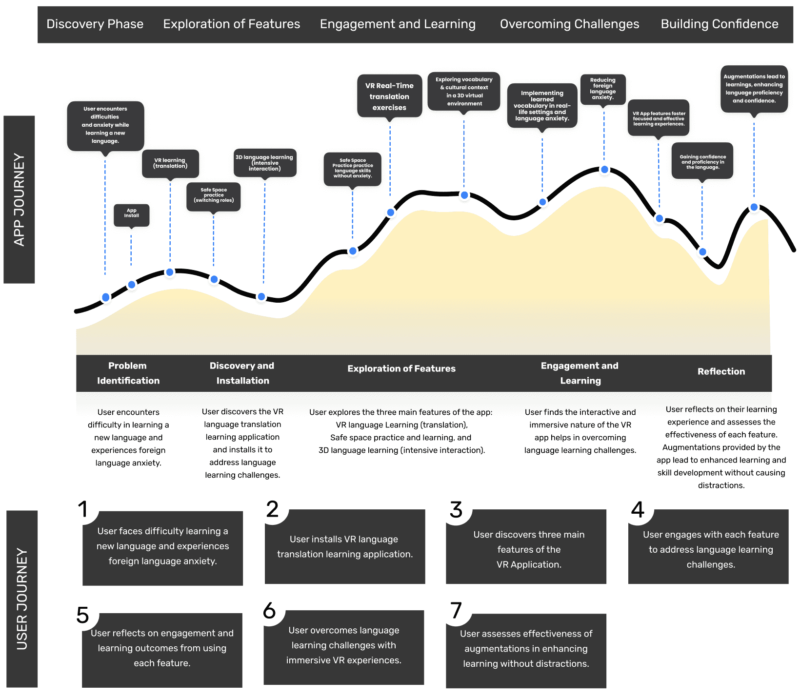 The Journey Map section outlines the app and user journey for the VR language learning project. It visualizes key touchpoints, from user onboarding and navigating immersive scenarios to completing language tasks and receiving feedback. The journey highlights user interactions at each stage, showcasing how the app guides learners through a seamless, engaging, and effective language learning experience.