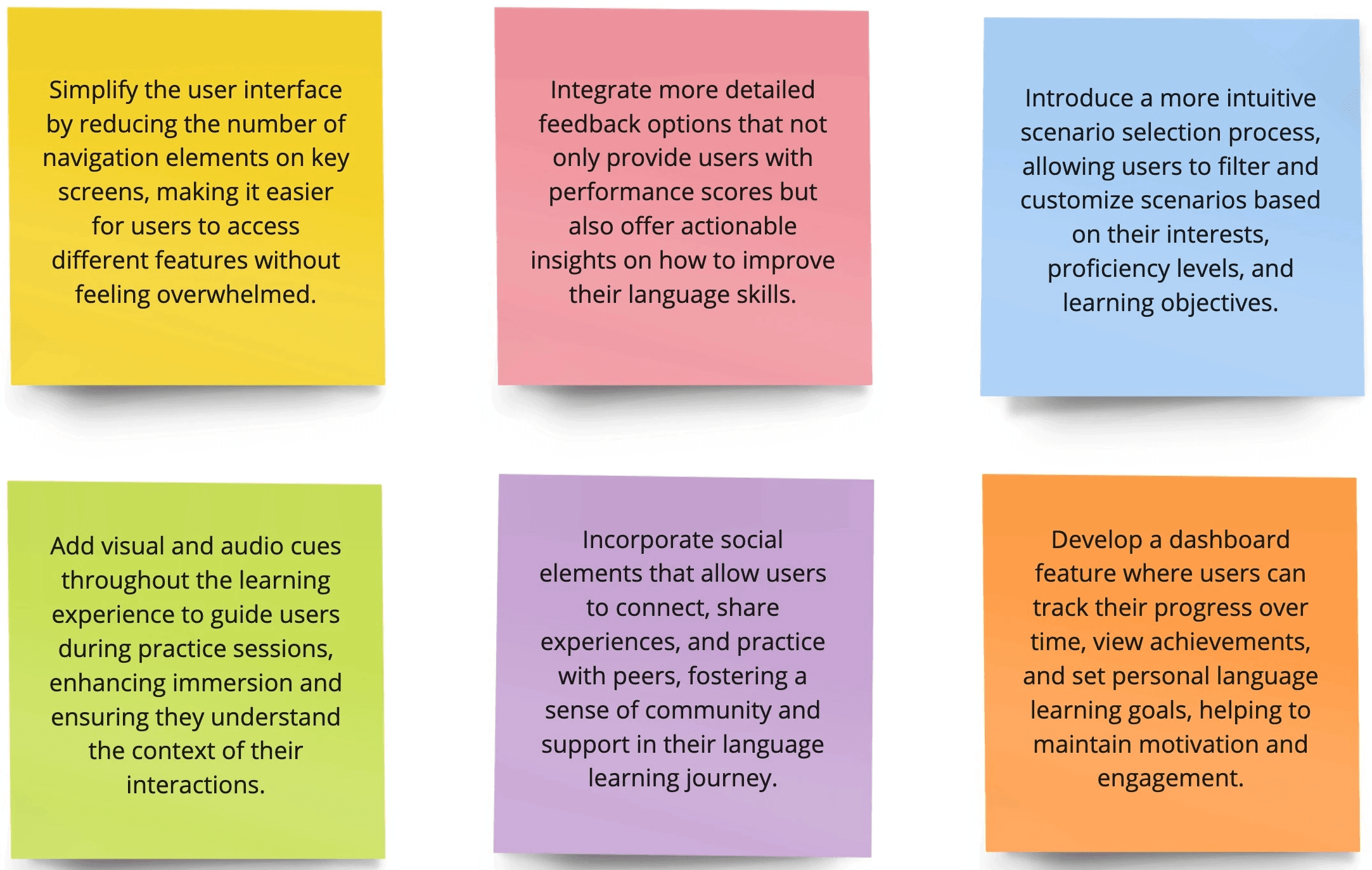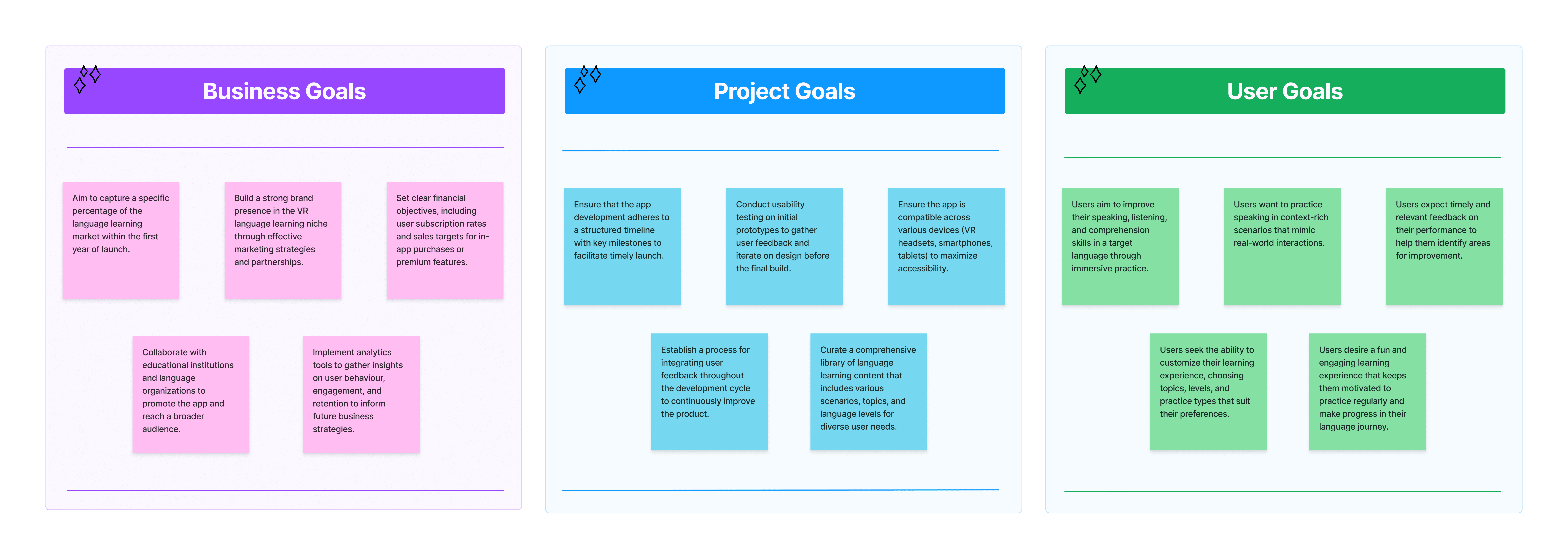 The "How Might We" (HMW) questions are a critical part of our foundational research, derived from the insights gathered during our user surveys. These questions guide the development of the VR Language Learning App by addressing key challenges in language acquisition. By answering these HMW questions, we aim to design a more effective, engaging, and personalized platform for learners from diverse backgrounds.