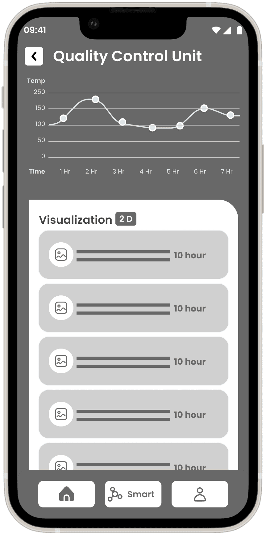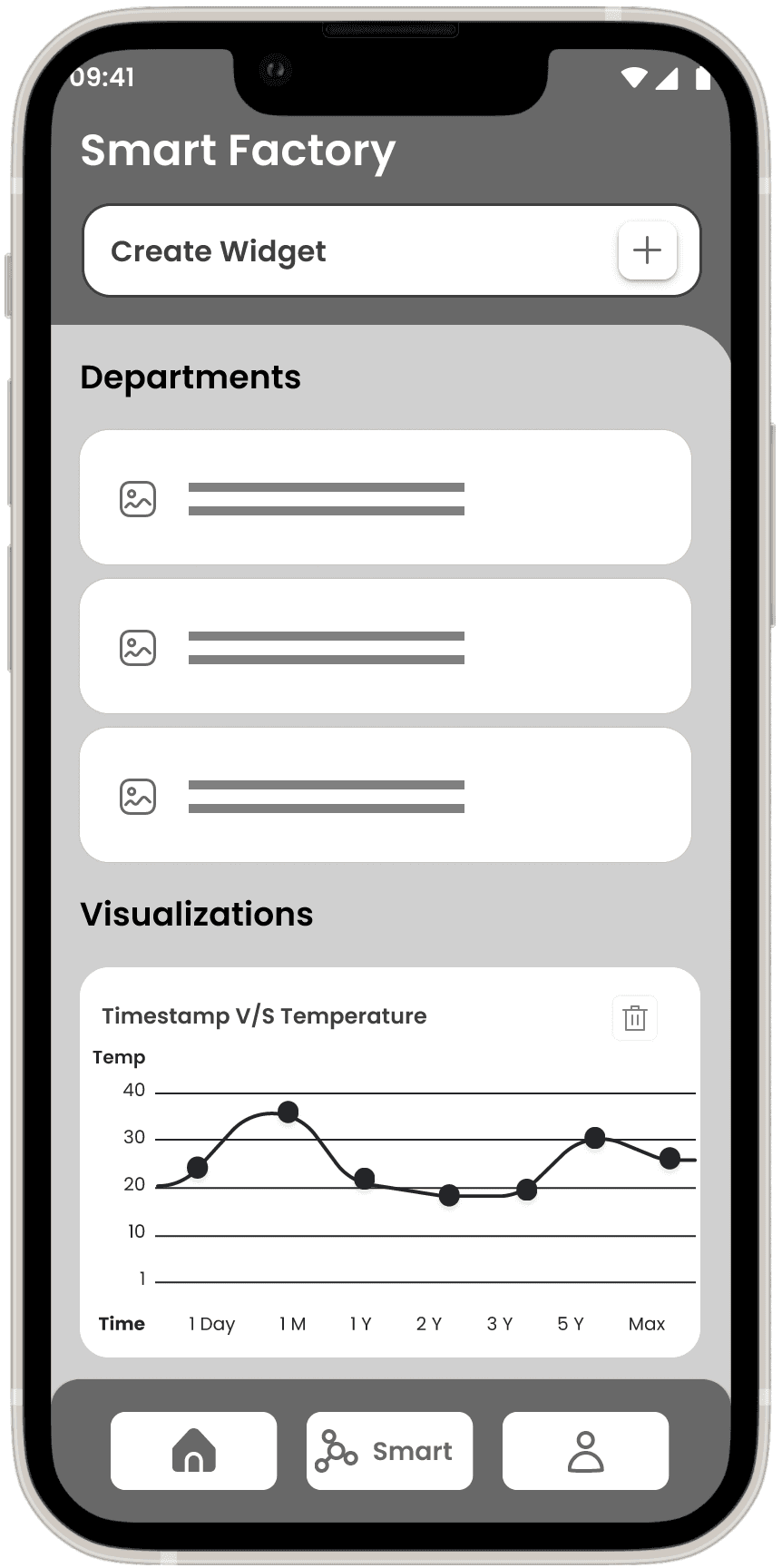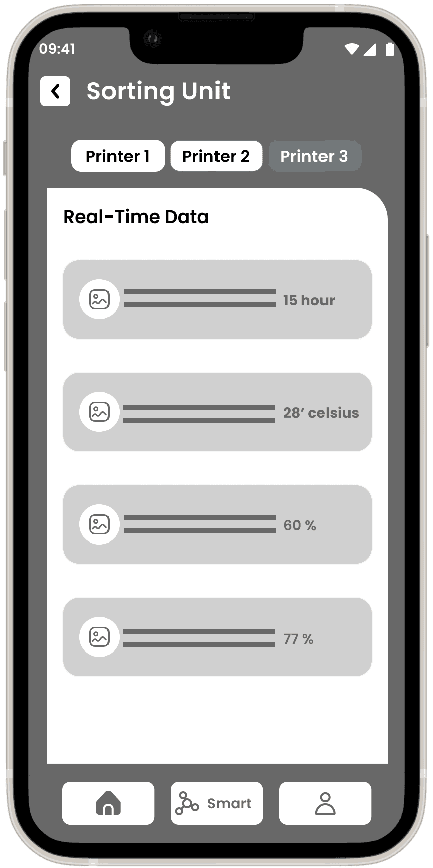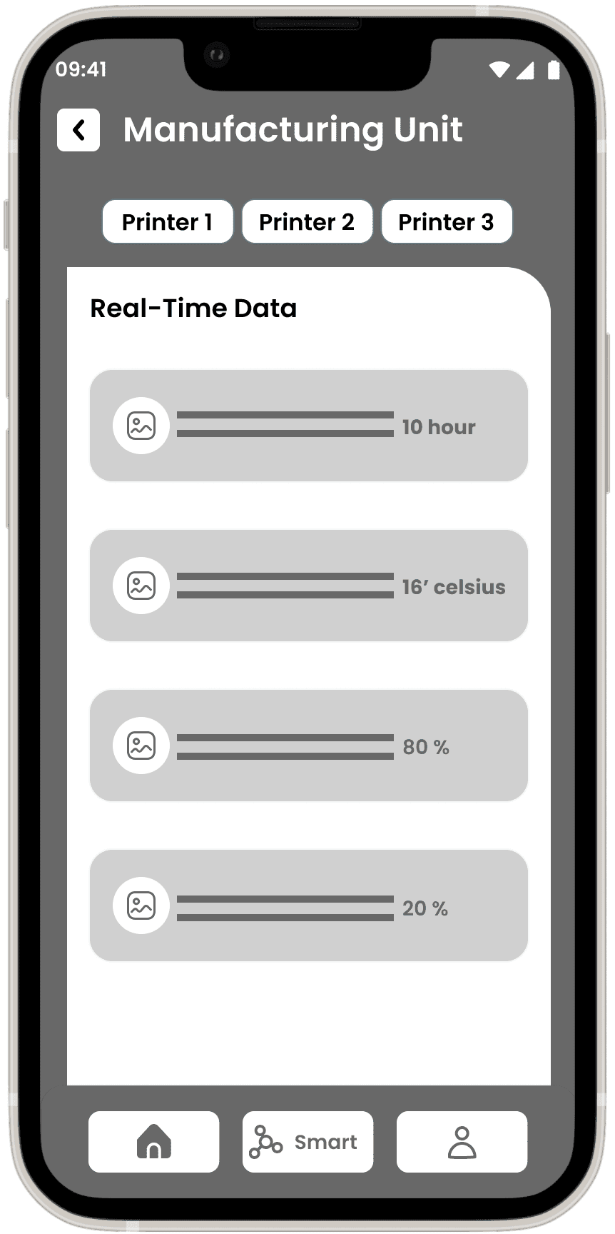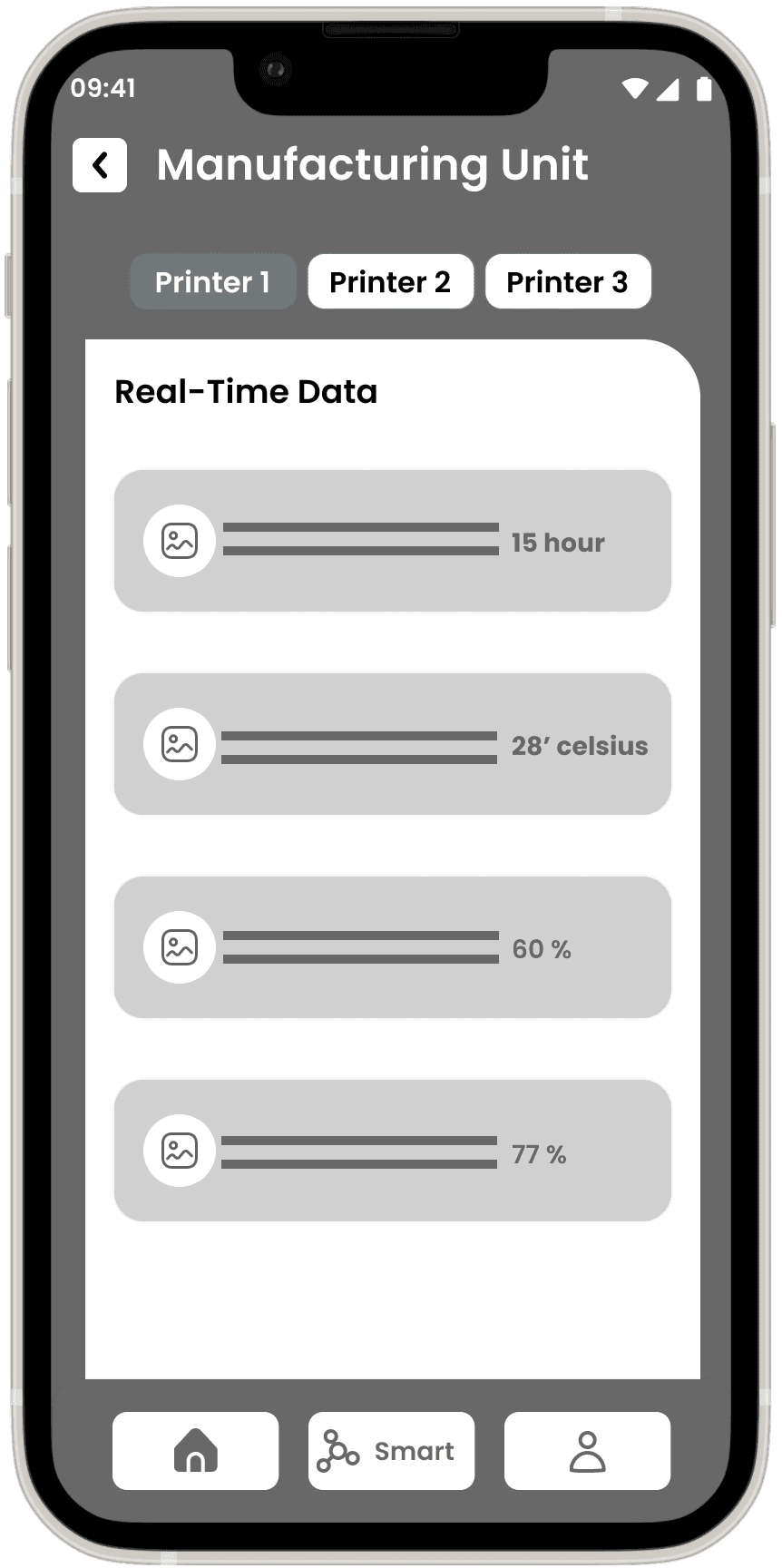 The Wireframes section for the Smart Factory Application presents a structured low-fidelity representation of the user interface and interactions within the app. Leveraging insights from the sitemap, user flows, and task flows, I have designed the low-fidelity wireframes to establish the foundational layout and functionality of the application.