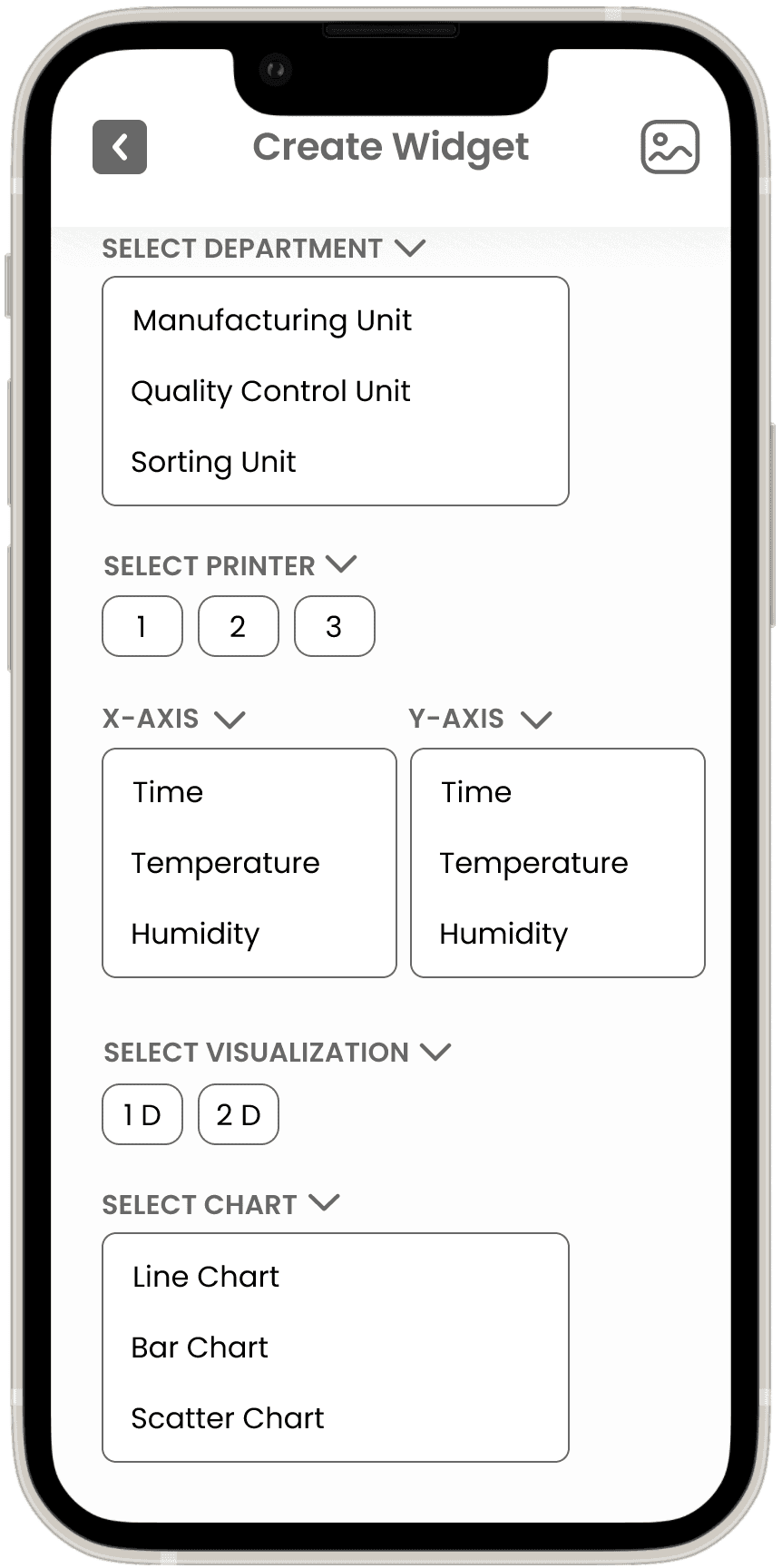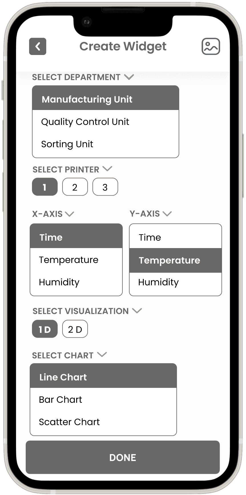 Task: Participants will create a new widget for visualizing temperature and humidity data from the sorting unit, selecting preferred visualization types (e.g., line chart, bar chart) and applying filters.
