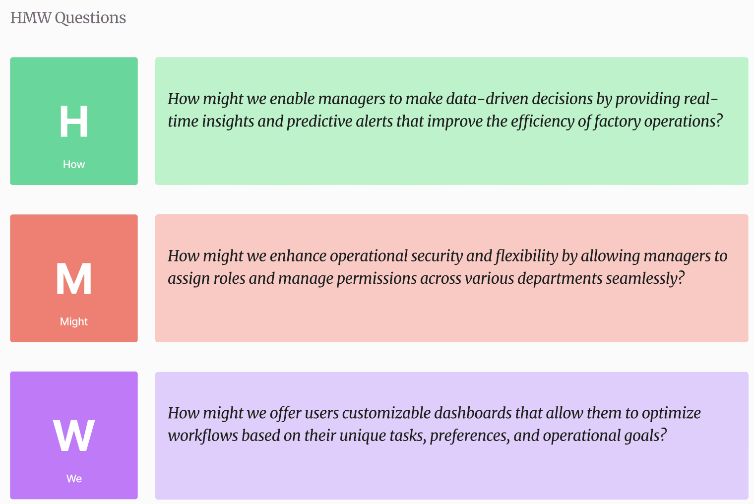 The "How Might We?" question serves as the foundation for guiding the design and development of this smart factory project, addressing user pain points through innovative technology-driven solutions. This HMW question will encapsulate the core objectives of the project and provide a clear direction for designing solutions that solve real-world challenges.