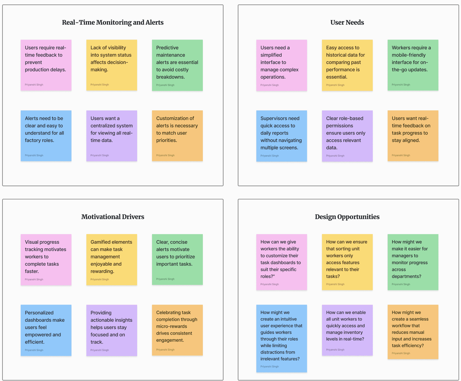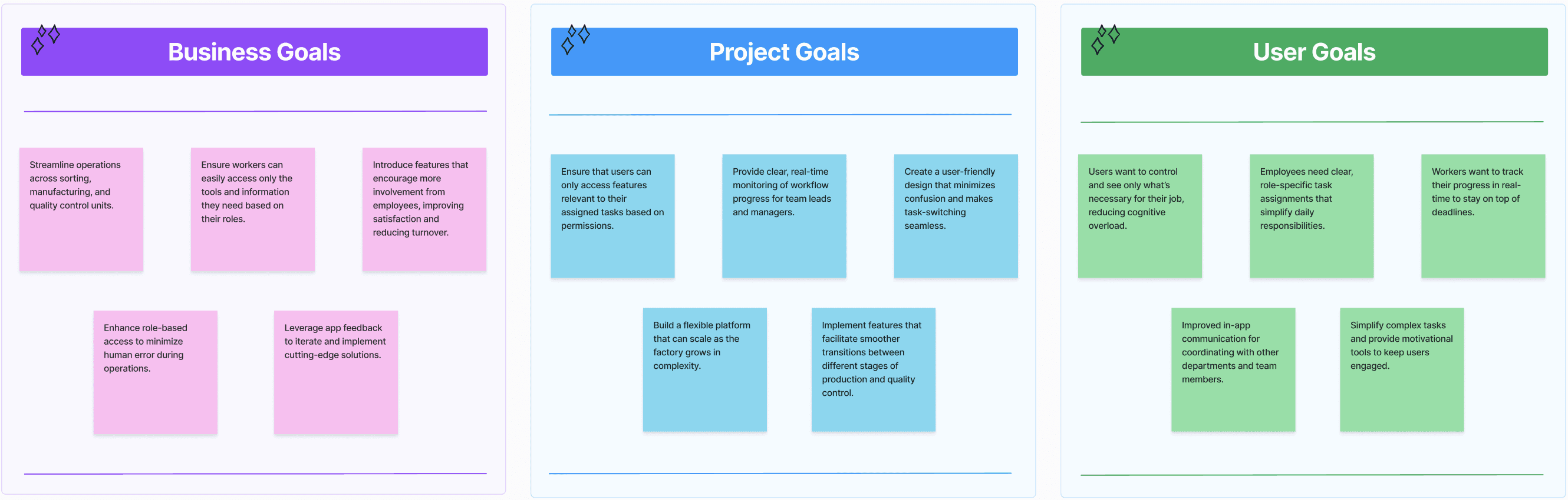 The goal of affinity mapping for this smart factory project is to categorize and analyze user insights from research, surveys, and feedback to uncover key pain points and opportunities in the current factory management processes.