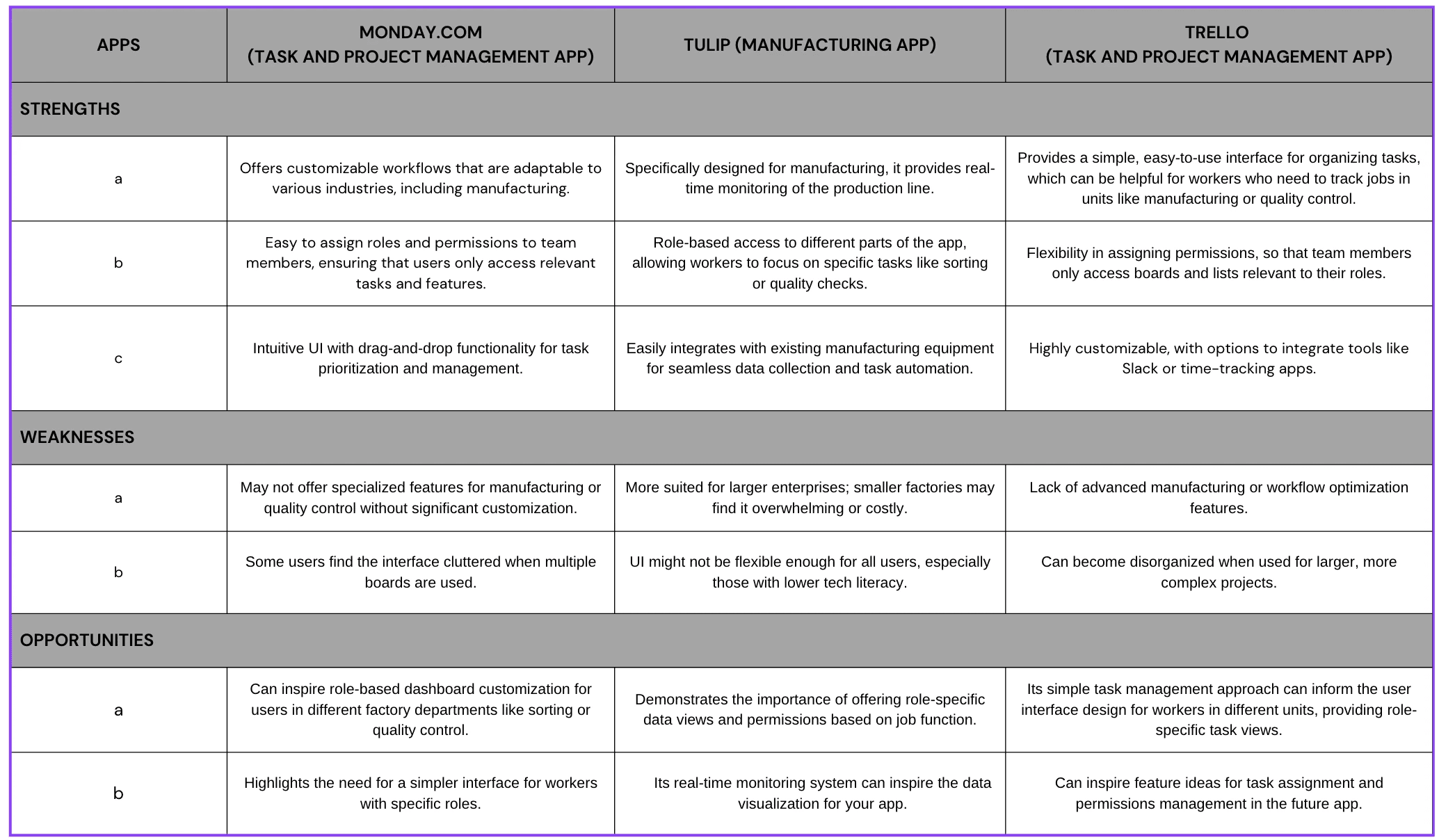 The competitive analysis for this project app involves a UX-focused comparison of three popular apps—Monday.com, Tulip, and Trello. By evaluating key features, user interfaces, and functionalities, the analysis aims to identify opportunities and gaps that can inspire design improvements for a streamlined, user-centric app experience.
